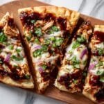 This Easy BBQ Chicken Pizza combines tender, smoky BBQ chicken with a crispy homemade pizza crust, melty mozzarella and smoked gouda cheeses, tangy BBQ sauce, and fresh cilantro for a flavorful and satisfying meal. Perfectly balanced with a hint of spice and sweetness, this crowd-pleasing pizza is baked to golden-brown perfection in your oven.