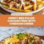 Loaded BBQ Pulled Chicken Fries feature crispy oven-baked russet potato fries topped with tender shredded chicken smothered in tangy BBQ sauce, melted cheddar cheese, fresh green onions, sour cream, and optional pickled jalapeños for a perfect balance of smoky, cheesy, and spicy flavors.