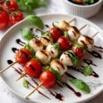 Delicious and easy-to-make Caprese Skewer Bites are the perfect light evening snack featuring cherry tomatoes, fresh basil, and mini mozzarella balls drizzled with olive oil and balsamic glaze. These fresh and colorful skewers are ideal for entertaining or a quick appetizer.