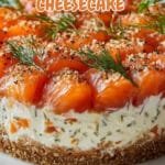 A sophisticated and savory smoked salmon cheesecake featuring a crunchy cracker base and a creamy filling made with ricotta, mascarpone, fresh dill, and Espelette pepper, perfect as an elegant appetizer or light main dish.
