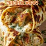 Delicious Cheesy Garlic Chicken Wraps with tender marinated chicken in a creamy, cheesy garlic sauce, wrapped in warm tortillas with fresh lettuce and tomatoes for a satisfying and flavorful meal.