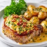 This Cheesy Pork Chop with Potatoes recipe delivers tender, juicy pork chops nestled on a bed of creamy, garlicky potatoes smothered in a rich homemade gravy. Perfectly seared pork chops are baked alongside potatoes in a flavorful thyme-infused sauce, making for a comforting and easy one-dish dinner.