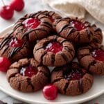 Delight in these rich and soft Chocolate Cherry Thumbprint Cookies, featuring a cocoa-infused buttery dough filled with tart cherry jam and topped with a smooth semi-sweet chocolate drizzle. Perfect for satisfying your sweet tooth with a luscious combination of chocolate and cherry flavors.