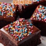 This Cosmic Brownie recipe features rich, fudgy brownies topped with a smooth chocolate ganache and colorful rainbow candy-coated chocolate chips for a fun and indulgent treat perfect for any occasion.