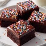 This Cosmic Brownie recipe features rich, fudgy brownies topped with a smooth chocolate ganache and colorful rainbow candy-coated chocolate chips for a fun and indulgent treat perfect for any occasion.