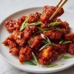 This Crispy Chilli Chicken recipe features tender chicken breast strips marinated in a flavorful soy and ginger mixture, double-fried to achieve a perfect crispy texture, and tossed in a sweet and spicy chilli sauce. Garnished with fresh spring onions, this dish is ideal as an appetizer or main course for lovers of bold, zesty flavors.