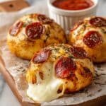 Easy Pepperoni Pizza Bombs are a quick and delicious lunch option featuring seasoned biscuit dough stuffed with melted mozzarella and mini pepperoni slices. These golden-brown, bite-sized treats are perfect for dipping and serving as a fun snack or light meal.