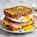 A delicious and hearty Egg and Ham Breakfast Sandwich made with fluffy scrambled eggs, melted cheddar cheese, savory deli ham, and buttery toasted bread. Perfect for a satisfying morning meal.