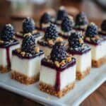 Delight in these Forbidden Forest Blackberry Cheesecake Bites featuring a crispy graham cracker crust, a smooth cream cheese filling, and luscious fresh blackberry topping, perfect for an elegant dessert or sweet snack.