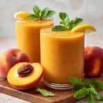 A refreshing Frozen Peach Lemonade Slushie made with frozen peaches, lemonade, and a touch of honey. Perfect for a quick, cooling treat on a hot day, garnished with fresh mint and lemon slices for added zest.