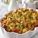 Grandma’s Thanksgiving Turkey Stuffing is a classic, comforting side dish made with dried bread cubes, sautéed celery and onion, poultry seasoning, and chicken stock. Baked to a golden brown, this flavorful stuffing brings warmth and tradition to your holiday meal.