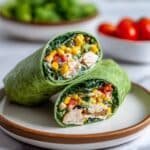 A fresh and healthy Green Goddess Chickpea Salad Wrap, featuring a creamy avocado yogurt dressing tossed with crisp spinach, cherry tomatoes, cucumber, red onion, and chickpeas, all wrapped in whole wheat tortillas for a nutritious and satisfying meal.
