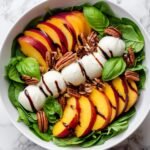 A refreshing and elegant Millionaire Peach Salad featuring ripe peaches, fresh mozzarella, arugula, toasted walnuts, crumbled feta, and fresh basil, all drizzled with a sweet balsamic glaze. Perfect as a light appetizer or side dish, this salad combines sweet, savory, and peppery flavors with delightful textures.
