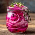 Quick Pickled Red Onions are a tangy and slightly sweet condiment made by soaking thinly sliced red onions in a hot vinegar-based brine. Perfect for adding a burst of flavor and crunch to salads, sandwiches, tacos, and more, this recipe is fast and easy, requiring minimal ingredients and time.