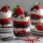Delightful and visually stunning Cheesecake Red Velvet Trifles featuring layers of moist red velvet cake, creamy cheesecake filling, chocolate cookie crumbs, and fresh strawberries. Perfect for individual servings at parties or gatherings.