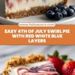 This vibrant 4th of July Swirl Pie features festive red, white, and blue layers that are perfect for any patriotic celebration. A crisp graham cracker crust is filled with a light, creamy cream cheese mixture, beautifully swirled with fresh strawberry and blueberry purees for a visually stunning and delicious dessert.
