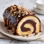 This Reese’s Roll Cake is a luscious peanut butter dessert featuring a light chocolate sponge cake rolled with creamy peanut butter filling and chopped mini Reese’s Peanut Butter Cups, finished with a rich chocolate ganache and garnished with Reese’s Pieces for an irresistible treat.