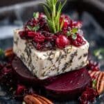 A delightful appetizer featuring tender roasted beet rounds topped with creamy Brie, sweet dried cranberries, toasted pecans, and a touch of honey, garnished with fresh herbs for a perfect balance of flavors and textures.