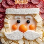Create a festive and delicious Santa Cheese Board perfect for Christmas parties, featuring a whimsical arrangement of assorted cheeses, pepperoni, olives, and crackers shaped like Santa Claus's face and hat.