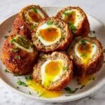 Classic Scotch Eggs with a flavorful sausage coating, crispy panko breadcrumb crust, and perfectly cooked eggs inside. This recipe features a blend of fresh herbs and spices in the sausage, boiled eggs with options for jammy or fully set yolks, and a deep-frying technique that delivers a golden, crunchy exterior. Ideal for a satisfying snack or brunch dish.