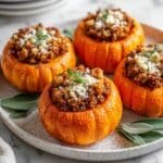 Enjoy the cozy flavors of fall with these Savory Beef Stuffed Mini Pumpkins. Tender mini pumpkins are hollowed out and filled with a rich mixture of ground beef, pumpkin puree, aromatic herbs, and warm spices, then baked until perfectly soft. This festive and hearty dish is perfect for a seasonal dinner or a unique holiday centerpiece.