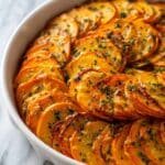 This Scalloped Sweet Potatoes recipe features thinly sliced sweet potatoes layered with cheese and seasoned milk, baked until tender and golden brown. It's a comforting side dish perfect for any dinner occasion.