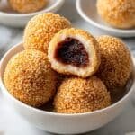 Sesame Balls with Red Bean Paste are a classic Asian treat featuring a chewy glutinous rice flour dough filled with sweet red bean paste, coated with crunchy sesame seeds, and deep-fried to golden perfection. This recipe guides you through making the dough, assembling the balls, and frying them to achieve a crispy exterior with a soft, flavorful interior.