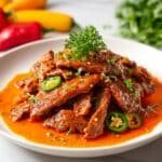 Zingy Dill Pickle Hot Sauce is a vibrant and tangy condiment combining chopped dill pickles, garlic, shallots, and chillies, simmered to develop rich flavors then blended into a smooth and luscious hot sauce with a perfect balance of vinegar and spice.